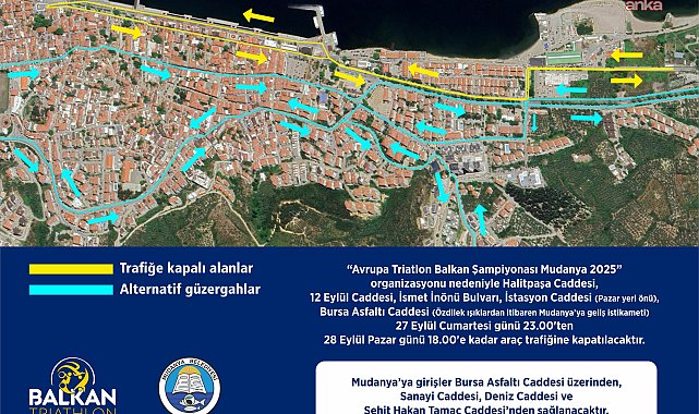 (BURSA)- Mudanya Belediyesi, Türkiye Triatlon Federasyonu iş birliğiyle düzenlenen '2025 Avrupa Triatlon Balkan Şampiyonası'na ev sahipliği yapmaya hazırlanıyor. 28 Eylül Pazar günü düzenlecek şampiyona dolayısıyla ilçe trafiğinde de düzenlemeler yapılacak."2025 Avrupa Triatlon Balkan Şampiyonası", Mudanya Belediyesi ile Türkiye Triatlon Federasyonu iş birliğiyle 28 Eylül Pazar günü Mudanya’da gerçekleştirilecek. Türkiye'den ve yabancı ülkelerden profesyonel ve amatör triatlerin yarışına sahne olacak şampiyona, yaş grupları, elit ve gençler kategorilerinde düzenlenecek. Sporcular kürsü görmek için yüzme, bisiklet ve koşu etaplarıyla Mudanya’nın doğal güzellikleri eşliğinde mücadele edecek.Trafikte düzenlemeŞampiyonanın verimli ve sorunsuz geçmesi için ilçe merkezinde trafik akışına da düzenleme getirildi. Halitpaşa Caddesi, 12 Eylül Caddesi, İsmet İnönü Bulvarı, İstasyon Caddesi (pazaryeri önü), Bursa Asfaltı Caddesi (Özdilek ışıklardan itibaren Mudanya’ya geliş istikameti) 27 Eylül Cumartesi günü 23.00'ten 28 Eylül Pazar günü 18.00'e kadar araç trafiğine kapalı olacak. Mudanya'ya girişler Bursa Asfaltı Caddesi üzerinden Sanayi Caddesi, Deniz Caddesi ve Şehit Hakan Tamaç Caddesi'ni takiben alternatif güzergahlar üzerinden sağlanacak.