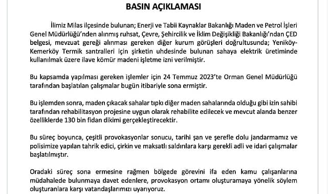 Muğla Valiliği, Akbelen Ormanı’ndaki ağaç kesiminin bugün itibarıyla tamamlandığını açıkladı. Valiliğin açıklamasında, “Bu süreç boyunca, çeşitli provokasyonlar sonucu, tarihi şan ve şerefle dolu jandarmamız ve polisimize yapılan tahrik edici, çirkin ve maksatlı saldırılara karşı gerekli adli ve idari çalışmalar başlatılmıştır. Oradaki süreç sona ermesine rağmen bölgede görevini ifa eden kamu çalışanlarına müdahalede bulunmaya davet edenlere, provokasyon ortamı oluşturmaya yönelik söylem oluşturanlara karşı vatandaşlarımızı uyarıyoruz” denildi.Muğla Valiliği, bugün yaptığı yazılı açıklamada, Milas ilçesindeki Akbelen Ormanı’nda kömür ocağını genişletmek amacıyla yapılan ağaç kesiminin bugün itibarıyla tamamlandığını duyurdu. Valiliğin açıklaması şöyle:"24 TEMMUZ 2023’TE ORMAN GENEL MÜDÜRLÜĞÜ TARAFINDAN BAŞLATILAN ÇALIŞMALAR BUGÜN İTİBARİYLE SONA ERMİŞTİR"“İlimiz Milas ilçesinde bulunan, Enerji ve Tabii Kaynaklar Bakanlığı Maden ve Petrol İşleri Genel Müdürlüğü’nden alınmış ruhsat; Çevre, Şehircilik ve İklim Değişikliği Bakanlığı’ndan ÇED belgesi, mevzuat gereği alınması gereken diğer kurum görüşleri doğrultusunda, Yeniköy-Kemerköy Termik santralleri için şirketin uhdesinde bulunan sahaya elektrik üretiminde kullanılmak üzere ilave kömür madeni işletme izni verilmiştir. Bu kapsamda yapılması gereken işlemler için 24 Temmuz 2023’te Orman Genel Müdürlüğü tarafından başlatılan çalışmalar bugün itibariyle sona ermiştir.Bu işlemden sonra, maden çıkacak sahalar tıpkı diğer maden sahalarında olduğu gibi izin sahibi tarafından rehabilitasyon projesine uygun olarak rehabilite edilecek ve mevcut alanda benzer özelliklerde 130 bin fidan dikimi gerçekleştirecektir.“ORADAKİ SÜREÇ SONA ERMESİNE RAĞMEN PROVOKASYON ORTAMI OLUŞTURMAYA YÖNELİK SÖYLEM OLUŞTURANLARA KARŞI VATANDAŞLARIMIZI UYARIYORUZ”Bu süreç boyunca, çeşitli provokasyonlar sonucu, tarihi şan ve şerefle dolu jandarmamız ve polisimize yapılan tahrik edici, çirkin ve maksatlı saldırılara karşı gerekli adli ve idari çalışmalar başlatılmıştır. Oradaki süreç sona ermesine rağmen bölgede görevini ifa eden kamu çalışanlarına müdahalede bulunmaya davet edenlere, provokasyon ortamı oluşturmaya yönelik söylem oluşturanlara karşı vatandaşlarımızı uyarıyoruz.”