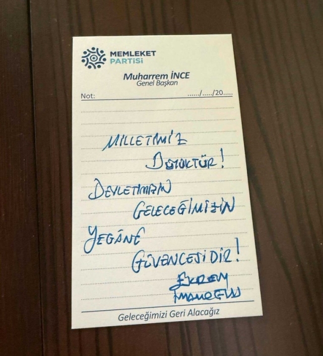 (ANKARA)-İBB Başkanı Ekrem İmamoğlu'nu ziyaret eden Muharrem İnce, İmamoğlu'nun el yazısı ile mesajını paylaştı. İmamoğlu'nun mesajında, "Milletimiz büyüktür, devletimizin, geleceğimizin yegane temelidir" ifadeleri yer aldı.Memleket Partisi Genel Başkanı Muharrem İnce, Silivri'deki Marmara Cezaevinde tutuklu bulunan CHP'nin Cumhurbaşkanı adayı ve İstanbul Büyükşehir Belediye(İBB) Başkanı Ekrem İmamoğlu'nu ziyaret etti. İnce, ziyaret sonrasında sosyal medya hesabından İmamoğlu'nun el yazısıyla yazılmış notunu kamuoyu ile paylaştı.İnce’nin sosyal medya hesabında paylaştığı İmamoğlu notunda şu ifadelere yer verildi:"Milletimiz büyüktür, devletimizin, geleceğimizin yegane temelidir"