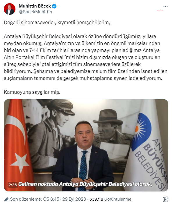 Antalya Büyükşehir Belediye Başkanı Muhittin Böcek, Antalya Altın Portakal Film Festivali'nin iptal edildiğini duyurdu. Böcek, "Altın Portakal Film Festivali siyaset üstüdür. Hiç kimsenin şüphesi olmasın ki festivalimizi kimsenin siyasi emellerine malzeme ettirmeyeceğim. Ayrıca şahsıma ve belediyemize malum film üzerinden isnat edilen suçlamaların tamamını gerçek muhataplarına aynen iade ediyorum. Az önce açıkladığım nedenler dolayısıyla; kendi kararıyla büyük bir karmaşaya neden olan Festival Yönetmeni'nin, Sanat Yönetmeni'nin ve oluşturdukları tüm sanat ekibinin görevlerine şu an itibarıyla son verilmiştir" dedi.