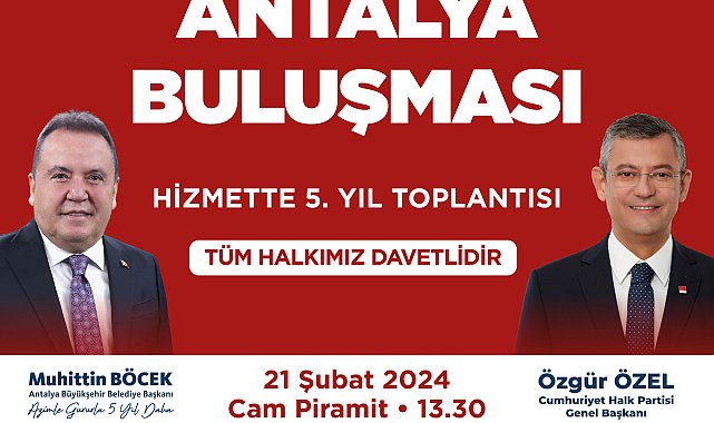 Antalya Büyükşehir Belediye Başkanı Muhittin Böcek, CHP Genel Başkanı Özgür Özel’in katılımıyla 21 Şubat Çarşamba günü (yarın) Cam Piramit Kongre Merkezi’nde düzenlenecek ‘Hizmette 5. Yıl’ toplantısına tüm Antalyalıları davet etti.Başkan Böcek, hizmette beş yılını anlatacağı ve Genel Başjan Özel’in de katılacağı ‘Hizmette 5. Yıl’ toplantısını yarın saat 13.30’da Cam Piramit Kongre Merkezi’nde düzenleyecek.Böcek, tüm Antalyalıları hizmet lansmanı ve aday tanıtım toplantısına davet etti.