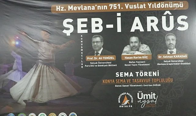 (ANTALYA)- Muratpaşa Belediye Başkanı Ümit Uysal, Abdullah Sevimçok Sivil Toplum ve İnovasyon Merkezleri’nde düzenlenen Şeb-i Arus Töreni’ne katıldı. Başkan Uysal, "Hz. Mevlâna’nın ışığı, aydınlığı, geniş ufku ve yaratılanı yaratandan ötürü seven anlayışı insanlara ışık tutmaya devam etsin" dedi.Hz. Mevlana'nın 751'inci vuslat yıl dönümü dolayısıyla Abdullah Sevimçok Sivil Toplum ve İnovasyon Merkezleri’nde (ASSİM) tören düzenledi. Törene, Belediye Başkanı Ümit Uysal’ın yanı sıra Konya kültür ve Dayanışma derneklerinin başkan ve yönetim kurulu üyeleri katıldı. Selçuk Üniversitesi Fars Dili ve Edebiyatı Bölümü öğretim üyesi Prof. Dr. Ali Temizel, Nefes Yayınevi Genel Yönetmeni Hasan Kerim Güç ve Selçuk Üniversitesi Mevlana araştırmacısı Dr. Selman Karadağ konuşmacı olarak yer aldığı gece, Konya Sema ve Tasavvuf Topluluğu’nun sema töreniyle sona erdi."Birbirimizin kıymetini bilmeye devam ediyoruz"Başkan Uysal, gecede yaptığı konuşmada, Muratpaşa’da birçok kültürden insanın bir arada yaşadığını vurgulayarak, "Biz Muratpaşa'mızda bir ortak yaşam kültürünü, varlığı, yokluğu paylaşarak, Türkiye'nin ve dünyanın dört bir yanından gelen insanlara ev sahipliği yapıyoruz. Muratpaşa'mızdaki bu barış, sevgi, saygı kültüründe birbirimizin kıymetini bilmeye devam ediyoruz. Burada Mevlana’nın düğün gecesinin vesilesiyle bir anma düzenledik. 17 Aralık 1273'te kendisi Hakk'ın rahmetine kavuştu. Allah rahmet etsin. Işığı, aydınlığı, geniş ufku ve yaratılanı yaratandan ötürü seven anlayışı insanlara ışık tutmaya devam etsin" dedi.