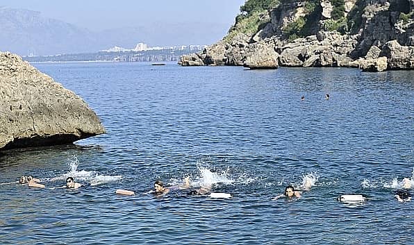 Muratpaşa Belediyesi, Süleyman Erol Yüzme Havuzu’nda gerçekleştirdiği su cimnastiğini yaz mevsimiyle birlikte denize taşıdı. Belediyenin dünyaca ünlü falez sahil bandında yer alan Mavi Bayraklı Erenkuş Falez Plajı’nda haftanın üç günü gerçekleşen etkinlik, saat 09.00’dan 10.00’a kadar devam ediyor.Spor eğitmeni Özlem Perçin’in yaptırdığı sabah sporu, karada ısınma hareketleriyle başlıyor. Isınma hareketlerinin ardından denize giren kadınlar, güvenlik sınırını belirleyen halata kadar yüzüyor. Sonrasında ise zaman zaman katılımcıları oldukça zorlayan cimnastik hareketleri başlıyor. Perçin, katılımın yoğun olduğu su cimnastiğinin kasların çalışmasını doğrudan etkileyen en önemli sporlardan birisi olduğunun altını çizdi. Perçin, fizik tedavi açısından doktorların da bu tarz etkinliklere katılımcıları yönlendirdiğini söyledi.Yaklaşık üç yıldır su cimnastiğine düzenli katıldığını anlatan Filiz Güneş ise “Yüzmeyi de burada öğrendim. Bu etkinlikler sayesinde kilolarımızı veriyoruz. Sağlıklı yaşam konusunda belediyemiz bize çok güzel imkanlar sağlıyor” diye konuştu.