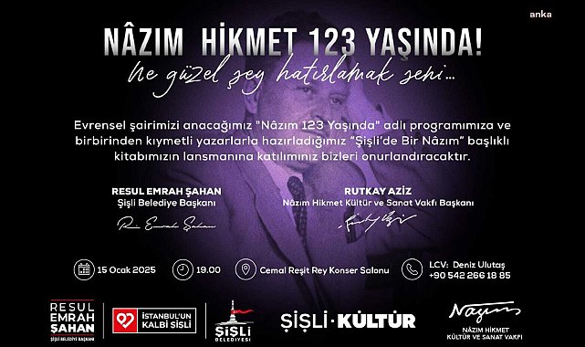 (İSTANBUL) - Şişli Belediyesi ile Nâzım Hikmet Vakfı'nın ortak çalışmasıyla hazırlanan "Ne güzel şey hatırlamak seni" adlı etkinlik 15 Ocak akşamı Harbiye Cemal Reşit Rey Konser Salonu'nda gerçekleşecek.Etkinlik öncesi saat 19.00'da Şişli Belediyesi'nce hazırlanan "Şişli'de Bir Nâzım" kitabının lansmanı ve kokteyl yapılacak. Saat 20.00'de programın açılış konuşmasını Nâzım Hikmet Vakfı adına Yönetim Kurulu Uyesi Zeynep Oral yapacak. Altan Gördüm'ün sunucu olduğu anma etkinliğinde ilkin geçen yıl yitirdiğimiz Genco Erkal'ın sesinden Nâzım Hikmet'in "Otobiyografi" şiiri dinlenecek. Ardından Halil Ergün, Tilbe Saran ve Selçuk Yöntem şairin çeşitli şiirlerini seslendirecekler. Levent Ülgen, Memleketimden İnsan Manzaraları'ndan "Kartallı Kâzım" bölümünü sahneleyecek.