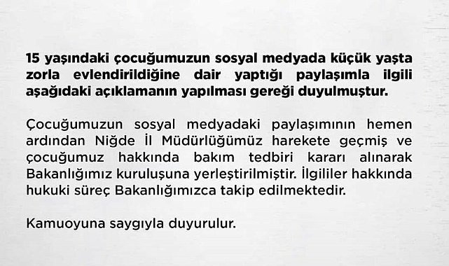 Niğde'nin Altunhisar ilçesi bağlı Keçikalesi’ndeki 15 yaşındaki bir kız zorla evlendirildiğini iddia ederek sosyal medyadan yardım istedi. Niğde Valiliği’nden yapılan yazılı açıklamada, "Bazı sosyal medya mecralarında; İlimiz Altunhisar İlçesine bağlı Keçikalesi Beldesinde ikamet eden bir kız çocuğunun, 15 yaşında zorla evlendirildiğine yönelik paylaşımları üzerine güvenlik güçlerimiz ve Aile Sosyal Hizmetler İl Müdürlüğü ekiplerimiz konunun takibi için ivedilikle harekete geçmişlerdir" ifadelerine yer verildi."OLAYIN TAKİPÇİSİ OLACAĞIZ"Niğde Barosu yaptığı yazılı açıklamada ise, "İlimizde bir kasabada 15 yaşındaki kız çocuğunun zoraki evlendirilmesi şeklindeki bir haberin sosyal medyaya düşmesi üzerine Niğde Barosu olarak Jandarmaya ihbarda bulunulmuştur ve İhbarımızın üzerine Kolluk Kuvvetlerince gerekli Araştırma başlatılmış ve çocuğa ulaşılmıştır. Ayrıca Niğde Barosu ve Niğde Barosu Çocuk Hakları Komisyonu da konunun ve hukuki sürecin takipçisi olacaktır" denildi.Aile ve Sosyal Hizmetler Bakanlığı da “Çocuğumuzun sosyal medyadaki paylaşımının hemen ardından Niğde İl Müdürlüğümüz harekete geçmiş ve çocuğumuz hakkında bakım tedbiri kararı alınarak Bakanlığımız kuruluşuna yerleştirilmiştir. İlgililer hakkında hukuki süreç Bakanlığımızca takip edilmektedir” açıklamasını yaptı."BENİM HAYALLERİMİ ÇALDILAR"15 yaşındaki kız çocuğu, sosyal medyadan yaptığı paylaşımlarda şu ifadelere yer verdi:"Aranızda benim gibi birisi yoktur öyle tahmin ediyorum. Benim gibiler genellikle şu anda taciz mağduru ve evde kocalarına nasıl hizmet etmesi gerektiğini öğreniyor. Sanki çocuk değilmişiz gibi. Parmağıma bu yüzüğü taktıkları zaman 14 yaşına yeni girmiştim ve şimdi olduğu gibi ailem yüzünden susmuştum. Tam bir buçuk yıl sürdü bu taciz. Bir buçuk yıl. Sizin için çok kısa bir zaman olabilir ama benim için hayatımın en kötü zamanlarıydı. Şimdi izin verirseniz bir buçuk yıl içersin de ne yaptı ve kimler yaptı anlatmak istiyorum. Bunu bana yapan benim teyzem pardon kaynanam ve bu işkenceyi yapan da kuzenim değil de müstakbel kocam ilk önce tesettüre girdim zorla. Sonra bana yaşımdan büyük gösteren kıyafetler aldılar. Benim evden dışarı çıkmama izin vermediler. Kimseyle konuşmama. Ben iki yıldır hiç dışarı çıkmadım. Ailem markete bile gitmeme izin vermedi. Ben 14 yaşında hapis hayatı yaşamaya başladım. Benim hayallerimi çaldılar."