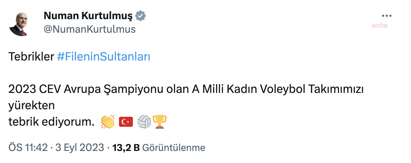 TBMM Başkanı Numan Kurtulmuş, “Tebrikler Filenin Sultanları. 2023 CEV Avrupa Şampiyonu olan A Milli Kadın Voleybol Takımımızı yürekten tebrik ediyorum” dedi.TBMM Başkanı Numan Kurtulmuş, 2023 CEV Avrupa Şampiyonası’nda Sırbistan’ı 3-2 yenerek şampiyon olan A Milli Kadın Voleybol Takımı’nı X (Twitter) hesabından yayınladığı mesajla kutladı. Kurtulmuş’un mesajı şöyle:“Tebrikler Filenin Sultanları. 2023 CEV Avrupa Şampiyonu olan A Milli Kadın Voleybol Takımımızı yürekten tebrik ediyorum.”