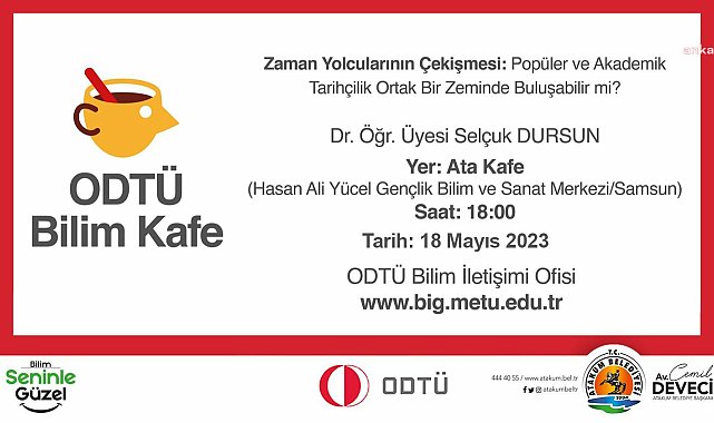 Orta Doğu Teknik Üniversitesi (ODTÜ), 18 Mayıs Perşembe günü saat 18.00’de Atakum Belediyesi Hasan Ali Yücel Gençlik, Bilim ve Sanat Merkezi’nde Bilim Kafe etkinliği düzenleyecek. ODTÜ tarafından bilim insanlarının katılımıyla, halka açık mekanlarda düzenlenen söyleşiler serisi “Bilim Kafe”, Atakum’da bilimseverlerle buluşuyor. Söyleşide, Dr. Öğr. Üyesi Selçuk Dursun, “Zaman Yolcularının Çekişmesi: Popüler ve Akademik Tarihçilik Ortak Bir Zeminde Buluşabilir mi” başlığında katılımcılara bilgi verecek.