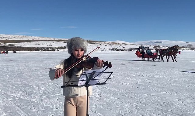 (ARDAHAN) - Doğu Anadolu Bölgesi’nin en büyük ikinci gölü olan Ardahan'ın Çıldır Gölü, bu yıl da yüzeyinin tamamen donmasıyla dikkat çekerken, tatil için Ardahan’a gelen Elazığlı 11 yaşındaki ortaokul öğrencisi Mihrimah Ela İrtegün de donan gölün üzerinde keman çaldı.