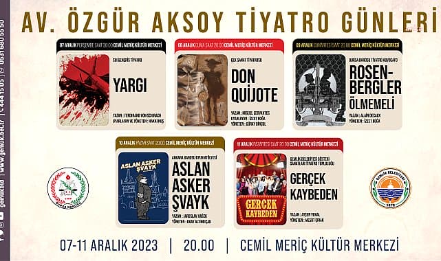 Gemlik Belediyesi ve Bursa Barosu’nun düzenlediği Özgür Aksoy Tiyatro Günleri, 7 Aralık’ta seyircisiyle buluşmaya hazırlanıyor.Bursa Gemlik Belediyesi ve Bursa Barosu’nun, Avukat Özgür Aksoy anısına düzenlediği Özgür Aksoy Tiyatro Günleri bu yıl da perdelerini 7 Aralık Perşembe günü açacak.Türkiye’nin dört bir yanındaki baroların tiyatro grupları 7-11 Aralık tarihlerinde, Gemlik’te sergileyecekleri oyunlarla seyirciyle bir araya gelecek. 5 farklı oyunun sergileneceği tiyatro günlerinde, tüm gösterimler saat 20.00’de Cemil Meriç Kültür Merkezi’nde yapılacak.Özgür Aksoy Tiyatro Günleri programının açılışı, 7 Aralık Perşembe günü, Cemil Meriç Kültür Merkezi’nde saat 20.00’de yapılacak. Sui Generis Tiyatro Topluluğu’nun sahneye koyduğu “Yargı” adlı tiyatro oyunuyla perdelerini açacak tiyatro günleri; 8 Aralık Cuma günü Çek Sanat Tiyatrosu’nun sahneye koyduğu “Don Quijote” ve 9 Aralık Cumartesi günü Bursa Barosu Tiyatro Advacato tarafından sahnelenecek “Rosenbergler Ölmemeli” oyunuyla devam edecek. 10 Aralık Pazar Günü, Ankara Barosu Oyun Atölyesi’nin oynadığı “Aslan Asker Shavyk” gösterimi tiyatroseverlerle buluşurken programın kapanışı 11 Aralık Pazartesi günü Gemlik Belediyesi Kültür Sanat Topluluğu’nun sahneye koyduğu “Gerçek Kaybeden” oyunuyla yapılacak.