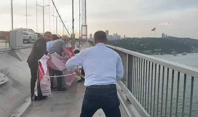 (İSTANBUL) -CHP Genel Başkanı Özgür Özel ve Sosyalist Enternasyonal heyeti, Boğaz Köprüsü’nün altından geçerken CHP milletvekilleri, Silivri’de tutuklu bulunan İstanbul Büyükşehir Belediye (İBB) Başkanı ve CHP'nin Cumhurbaşkanı adayı Ekrem İmamoğlu'nun görsellerinin yasaklanmasına tepki olarak Boğaz Köprüsü’ne “İmamoğlu'na özgürlük” yazılı pankart astı.
