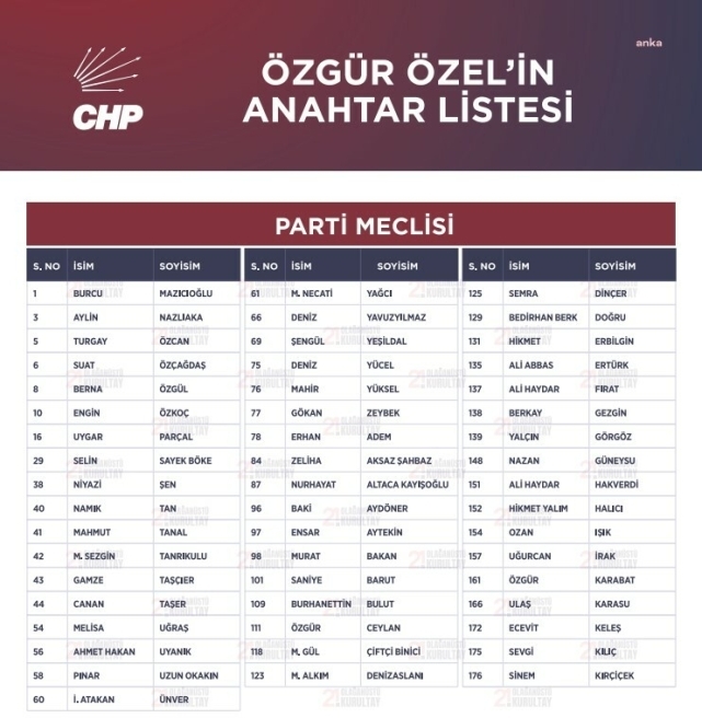 HABER: GÜLARA SUBAŞI/İLEYDA ÖZMEN - KAMERA: GURBETELLİ YALÇIN/YASİN KABADAYI(ANKARA) - CHP'nin 21'inci Olağanüstü Kurultayı'nda Parti Meclisi (PM), Yüksek Disiplin Kurulu (YDK) ve Bilim Kültür Sanat Platformu üyelikleri için kullanılan oyların sayımı tamamlandı. Açıklanan sonuçlara göre, CHP Genel Başkanı Özgür Özel'in delegeye sunduğu anahtar liste tamamen kabul edildi, anahtar liste dışından hiçbir aday listeyi delemedi. CHP'nin 21'inci Olağanüstü Kurultayı dün saat 10.00'da Nazım Hikmet Kültür Merkezi'nde toplandı. Kurultayda, kürsü konuşmalarının ve Genel Başkanlık seçimlerinin ardından saat 20.00 sıralarında başlayan PM ve YDK ile Bilim Kültür Kurulu üyelikleri için seçimler saat 23.50'de tamamlandı ve oy sayımına geçildi. Oy sayımı 03.30 sıralarında tamamlanarak, sonuçlar açıklandı. PM, YDK ve Bilim Kültür Sanat Platformu'na seçilen isimler, kurultay salonundaki dev ekrana yansıtıldı.PM, YDK ve Bilim Kurulu üyelikleri için kurultayda, Genel Başkan Özgür Özel'in anahtar listesi ile İstanbul Milletvekili Oğuz Kaan Salıcı öncülüğünde hazırlanan "Denge ve Dayanışma" ve Elazığ Milletvekili Gürsel Erol tarafından hazırlanan "Ortak Akıl Ortak Vicdan" listelerindeki isimler yarıştı.Oy sayımının sonucunda saat 03.50 itibarıyla açıklanan listeye göre, CHP Lideri Özel'in anahtar listesi firesiz geçti. Bin 323 kayıtlı delegenin olduğu kurultaydaki seçimlere göre, CHP'nin yeni PM'si şu isimlerden oluşuyor: Deniz Yavuzyılmaz Suat Özçağdaş Mahmut Tanal M. Gül Çiftci Binici Ensar Aytekin Hikmet Erbilgin Gamze Taşcıer Ali Abbas Ertürk Canan Taşer Mahir Yüksel Namık Tan Turgay Özcan SElin Sayek Böke Özgür Karabat Berkay Gezgin Erhan Adem Baki Aydöner Semra Dinçer Saniye Barut Deniz Yücel Nuhayat Altaca Kayışoğlu Ozan Işık Ali Haydar Hakverdi Yalçın Görgöz Burhanettin Bulut Ali Haydar Fırat Murat Bakan Melisa Uğraş Pınar Uzun Okakın Ulaş Karasu Bedirhan Berk Doğru Hikmet Yalım Halıcı Nazan Güneysu Burcu Mazıcıoğlu Mehmet Necati Yağcı Zeliha Aksaz Şahbaz İsmail Atakan Ünver Ecevit Keleş Mustafa Sezgin Tanrıkulu Berna Özgül Şengül Yeşildal Mehmet Alkım Denizaslanı Gökan Zeybek Uğurcan İrak Özgür Ceylan Sinem Kırçiçek Sevgi Kılıç Engin Özkoç Niyazi Şen Aylin Nazlıaka Ahmet Hakan Uyanık Uygar ParçalYDK listesinde şu isimler yer aldı: Özgür Sağlam Deniz Çakır Turan Taşkın Özer Ayça Akpek Şenay Süleyman Bülbül İsmail Emre Telci Nurdan Yücal Esin Fatma Temel Aysemin Gülmez Hümeyra Akkuş Sandıkçı Deniz Demiröz Özkan Tice Ali Balta Ekincan Aksoy Remzi KazmazBilim Kültür Sanat Platformu üyeleri şöyle: Yalçın Karatepe Yankı Bağcıoğlu Emine Uçak Erdoğan Gülşah Deniz Atalar Gökçe Gökçen Bahadır Erdem Baran Bozoğlu Berker Esen Baran Seyhan Armağan Erdoğan Örsan Kunter Öymen Taner DemirerPM yedek listesi ise şu isimlerden oluştu: Orhan Sarıbal Deniz Demir Mustafa Tunç Soyer Koza Yardımcı Oğuz Kaan Salıcı Müslim Sarı Ali Öztunç Selçuk Sarıyar Mahir Polat Gonca Yelda Orhan