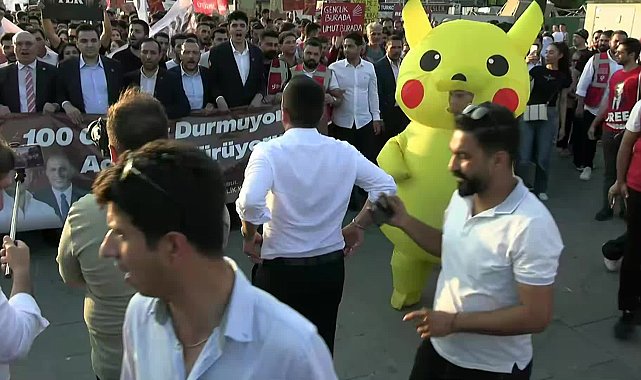 Haber/Kamera: Hakan KAYA(İSTANBUL) CHP'nin Cumhurbaşkanı adayı Ekrem İmamoğlu'nun tutuklanmasının 100. gününde düzenlenen "Millet İradesine Sahip Çıkıyor" buluşması için CHP İstanbul Gençlik Kolları Vatan Caddesi'nden Saraçhane'ye bir yürüyüş düzenledi. Yürüyüşe Pikachu kostümlü protestocu olarak bilinen Hasan Taşkan da katıldı.18 Mart'ta üniversite diploması iptal edilen, ertesi gün de gözaltına alınan CHP'nin Cumhurbaşkanı adayı, İBB Başkanı Ekrem İmamoğlu'nun 23 Mart'ta tutuklanmasının üzerinden 100 gün geçti. CHP, İmamoğlunun tutuklanmasının 100. günü nedeniyle gözaltı sürecinde bir hafta aralıksız eylem düzenlenen Saraçhane'de "Millet İradesine Sahip Çıkıyor" buluşması gerçekleştirdi.Buluşma öncesi CHP İstanbul Gençlik Kolları Vatan Caddesi'nde bir kortej oluşturdu. Şaraçhane'ye bir yürüyüş gerçekleştiren gençler "Gün gelecek, devran dönecek AKP halka hesap verecek" "Hükumet istifa", "Gözaltılar, tutuklamalar, baskılar bizi yıldıramaz" şeklinde sloganlar atıp, tutuklu başkanların resimlerinin bulunduğu "100 gündür durmuyoruz, adalete yürüyoruz" ponkartı taşıdı.Pikachu da katıldıYürüyüşe, Pikachu kostümlü protestocu olarak bilinen Hasan Taşkan, ilk Saraçhane eylemlerinde gözaltına alınıp bir süre tutuklu kalan CHP PM üyesi Berkay Gezgin, CHP Şanlıurfa Milletvekili Mahmut Tanal, CHP Gençlik Kolları Genel Başkanı Cem Aydın da katıldı.