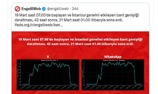 (ANKARA) - İfade Özgürlüğü Derneğinden Prof. Dr. Yaman Akdeniz, 19 Mart Çarşamba gününden itibaren uygulanan ''bant daraltmanın'' sona erdiğini bildirdi.İstanbul Büyükşehir Belediye Başkanı Ekrem İmamoğlu’nun gözaltına alınmasının ardından İstanbul Valiliğinden eylem, gösteri ve basın açıklaması yasağı getirilirken, internet erişim de kısıtlanmıştı.İfade Özgürlüğü Derneğinden Prof. Dr. Yaman Akdeniz, konuya ilişkin sosyal medya hesabından yaptığı açıklamada, ''İstanbul genelini hedef alan 'bant daraltma' uygulaması sona erdi. Resmi açıklama yapılmadı'' ifadelerine yer verdi.