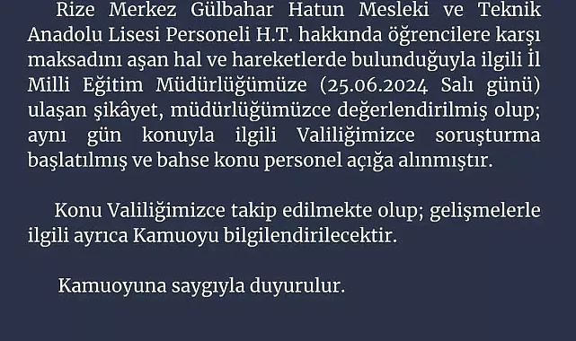 "Rize Merkez Gülbahar Hatun Mesleki ve Teknik Anadolu Lisesi Personeli H.T. hakkında öğrencilere karşı maksadını aşan hal ve hareketlerde bulunduğuyla ilgili İl Milli Eğitim Müdürlüğümüze (25.06.2024 Salı günü) ulaşan şikâyet, müdürlüğümüzce değerlendirilmiş olup; aynı gün konuyla ilgili Valiliğimizce soruşturma başlatılmış ve bahse konu personel açığa alınmıştır. Konu Valiliğimizce takip edilmekte olup; gelişmelerle ilgili ayrıca Kamuoyu bilgilendirilecektir.”