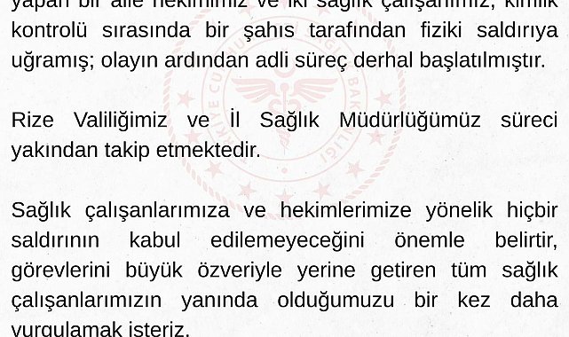 Haber: Gençağa KARAFAZLI (RİZE) - Rize İl Sağlık Müdürlüğü, Pazar ilçesindeki 1 No'lu Aile Sağlığı Merkezi'nde sağlık çalışanlarını darbeden saldırgan hakkında adli sürecin başlatıldığını açıkladı.Rize'nin Pazar ilçesinde 1 No'lu Aile Sağlığı Merkezi'nde görevli bir doktor ve sekreter, muayene için gelen bir kişinin sözlü ve fiziki saldırısına uğradı. Kimlik kontrolü sırasında başlayan tartışmada şahıs, görevliye de saldırdı. Sağlık çalışanları şikayetçi olurken, saldırgan gözaltına alındı; soruşturma devam ediyor.Rize İl Sağlık Müdürlüğü'nden konuyla ilgili şu açıklama yapıldı:"Pazar ilçe Sağlık Müdürlüğü hizmet binamız içerisinde yer alan Pazar 1 No'lu Aile Sağlığı Merkezinde görev yapan bir aile hekimimiz ve iki sağlık çalışanımız, kimlik kontrolü sırasında bir şahıs tarafından fiziki saldırıya uğramış; olayın ardından adli süreç derhal başlatılmıştır. Rize Valiliğimiz ve il Sağlık Müdürlüğümüz süreci yakından takip etmektedir. Sağlık çalışanlarımıza ve hekimlerimize yönelik hiçbir saldırının kabul edilemeyeceğini önemle belirtir, görevlerini büyük özveriyle yerine getiren tüm sağlık çalışanlarımızın yanında olduğumuzu bir kez daha vurgulamak isteriz."