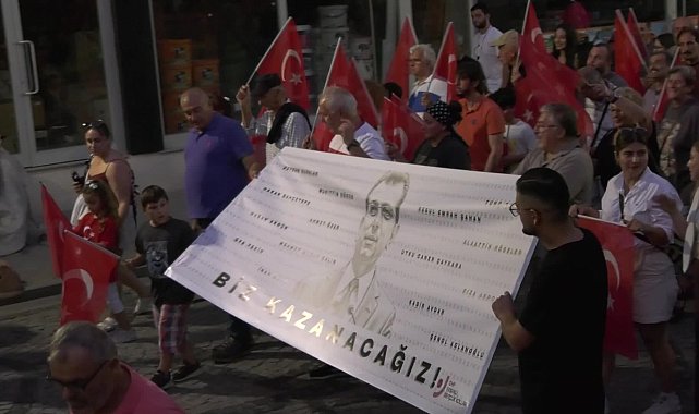 Fındıklı'da Tahiroğlu Köprüsü önünde toplananlar, Cumhuriyet Caddesi'ne doğru yürüyüşe geçti. Ellerinde Türk bayrakları ve CHP'li tutuklu belediye başkanlarının isimlerinin yer aldığı pankartlarla yürüyen katılımcılar, İzmir Marşı eşliğinde festival alanına ulaştı.