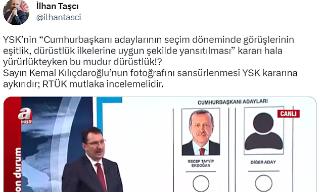 Radyo ve Televizyon Üst Kurulu (RTÜK) üyesi İlhan Taşcı, dün A Haber ekranlarında bir haberde; oy pusulasında Millet İttifakı Cumhurbaşkanı Adayı ve CHP Genel Başkanı Kemal Kılıçdaroğlu’nun sansürlenerek Cumhur İttifakı Adayı Recep Tayyip Erdoğan'ın tek aday gibi gösterilmesine tepki gösterdi. Taşcı, “Sayın Kemal Kılıçdaroğlu’nun fotoğrafını sansürlenmesi YSK kararına aykırıdır; RTÜK mutlaka incelemelidir” dedi.A Haber ekranlarında 28 Mayıs’ta yapılacak Cumhurbaşkanlığı ikinci tur seçimleri için “Oy kullanırken dikkat geçersiz olmasın” başlığıyla yapılan bir haberde, ekrana yansıtılan oy pusulasında Millet İttifakı Adayı ve CHP Genel Başkanı Kemal Kılıçdaroğlu’nun fotoğrafı sansürlendi. Ekrana yansıtılan pusulada sadece Cumhur İttifakı Cumhurbaşkanı Adayı Recep Tayyip Erdoğan’ın fotoğrafı yer alırken, Kılıçdaroğlu’nun ismine de yer verilmedi. Kılıçdaroğlu’nun oy pusulasında bulunduğu yer “diğer aday” olarak gösterildi.RTÜK’ün CHP kontenjanından seçilen üyesi İlhan Taşcı, söz konusu görüntüleri Twitter hesabından paylaşarak Radyo Televizyon Üst Kurulu’nu göreve çağırdı. Taşcı paylaşımında A Haber tarafından Kılıçdaroğlu’nun fotoğrafının sansürlenmesinin Yüksek Seçim Kurulu kararına da aykırı olduğunu vurguladı.Taşcı’nın paylaşımı şöyle:“YSK’nin ‘Cumhurbaşkanı adaylarının seçim döneminde görüşlerinin eşitlik, dürüstlük ilkelerine uygun şekilde yansıtılması’ kararı hala yürürlükteyken bu mudur dürüstlük? Sayın Kemal Kılıçdaroğlu’nun fotoğrafını sansürlenmesi YSK kararına aykırıdır; RTÜK mutlaka incelemelidir.”