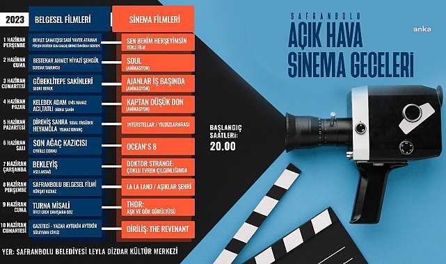 Safranbolu'da 24'üncüsü düzenlenecek Uluslararası Altın Safran Belgesel Film Festivali kapsamında ödüllü belgesel ve sinema filmlerinin gösteriminin yapılacağı Açık Hava Sinema Geceleri, 'Devlet Sanatçısı Sadi Yaver Ataman Belgeseli' ve 'Sen Benim HerŞeyimsin' filmlerinin gösterimiyle başlayacak.Leyla Dizdar Kültür Merkezi’nin bahçesinde düzenlenecek etkinlikte vatandaşlar kamp sandalyeleri ve minderlerini getirerek alanda yer alan çimlerin üzerinde film izlemenin keyfini yaşayacak.1-10 Haziran günleri arasında vatandaşlar, toplam 20 ödüllü belgesel ve sinema filmiyle buluşacak."AÇIK HAVA SİNEMA GÖSTERİMLERİMİZ GELENEKSEL HALE GELDİ"Safranbolu Belediye Başkanı Elif Köse, etkinlikle ilgili şunları söyledi:"Açık hava sinema gösterimlerimiz her sene artık geleneksel hale geldi. Uluslararası Altın Safran Belgesel Film Festivali öncesinde halkımızla filmleri buluşturuyoruz. Her akşam bir belgesel film birde Türk sinemasının klasikleşmiş, önceki dönemlerde beğeni kazanmış filmlerini seçtik. Amacımız bir yandan festivale yakışır bir program yapmak, diğer yandan insanımızın günlük streslerini atmalarını sağlamak. Geçen yıl olduğu gibi ilginin yoğun olacağını düşünüyorum” dedi.