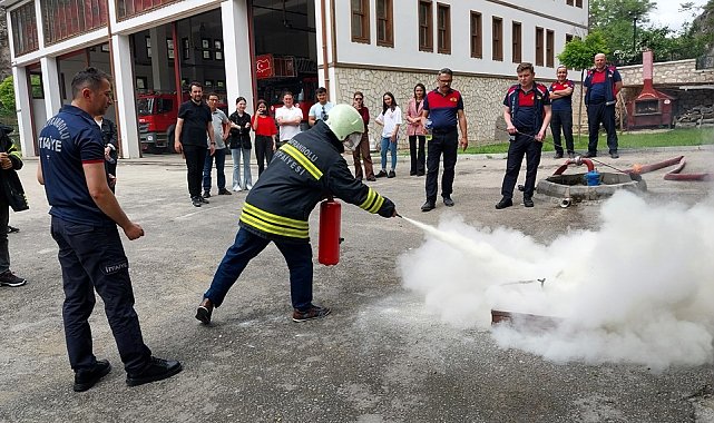 Safranbolu Belediyesi İtfaiye Müdürlüğü, kamu kurum ve kuruluşları ile okullara yönelik yangın eğitim programlarına devam ediyor.Yıl boyunca çeşitli kurumları ziyaret ederek ya da müdürlük hizmet binasında, yangın önlemleri, yangın anında yapılması gerekenler gibi konularda çeşitli eğitimler veren Safranbolu Belediyesi İtfaiye Müdürlüğü, son olarak Karabük Üniversitesi, Sürekli Eğitim Merkezi Temel Aşçılık ve Fast Food Kursu öğrencilerine uygulamalı eğitim verdi.İş Güvenliği dersi kapsamında Safranbolu Turizm Fakültesi Gastronomi ve Mutfak Sanatları Öğretim Görevlisi Tolgahan Tabak’ın eşlik ettiği öğrenciler, yangın tüpü kullanımı hakkında da bilgi aldılar.Öğrencilere eğitim sonunda 'İş Sağlığı ve Güvenliği Katılım Belgesi' verildi."DONANIMLI BİR İTFAİYEYE SAHİBİZ"Konu ile ilgili kısa bir açıklama yapan Safranbolu Belediye Başkanı Elif Köse, “ Bölgemizin en kapsamlı ve donanımlı itfaiye müdürlüğüne sahibiz. Müdürlüğümüz bu donanımı kurum ve okullarımızla da paylaşıyorlar ki insanlarımız yangına anında müdahale edebilsinler. Bu nedenle eğitimlerimiz ara vermeden devam edecek” dedi.