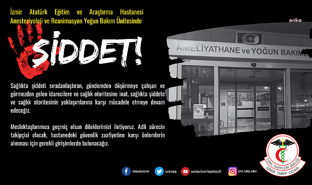 (İZMİR) - İzmir Atatürk Eğitim ve Araştırma Hastanesi Anesteziyoloji ve Reanimasyon Yoğun Bakım Ünitesi’nde görevli Dr. Hüseyin Emrah Keskin ile asistanı Dr. Hazal Yaşar Çokyaman, vefat eden bir hastanın yakınları tarafından darp edildi. İzmir Tabip Odası, “Hiçbir şiddet eyleminin her ne gerekçe ile olursa olsun makul gösterilmesi kabul edilemez. Bu vahşeti kabullenmek mümkün değildir” açıklamasını yaptı.İzmir Atatürk Eğitim ve Araştırma Hastanesi Anesteziyoloji ve Reanimasyon Yoğun Bakım Ünitesi’nde tedavi gören bir hasta dün hayatını kaybetti. Vefat haberini yakınları ile paylaşan Dr. Hüseyin Emrah Keskin ile asistanı Dr. Hazal Yaşar Çokyaman, hasta yakınları tarafından darp edilmesi sonucu yaralandı.İzmir Tabip Odası Yönetim Kurulu, konuyla ilgili açıklama yaptı. Açıklamada, şunlar kaydedildi:“Mücadele etmeye devam edeceğiz”“İzmir Atatürk Eğitim ve Araştırma Hastanesi Anesteziyoloji ve Reanimasyon Yoğun Bakım Ünitesinde yaklaşık 1 yıldır tedavi görmekte olan immobil bir bakım hastası 26.06.2024 tarihinde akşam saatlerinde vefat etmiştir.Yoğun bakım biriminde görevli uzman ve asistan meslektaşlarımız, hastanın vefat haberini hasta yakınları ile paylaşmakta iken hasta yakınlarından birisi bir meslektaşımıza saldırmış, kafasına yumrukla 3-4 kez vurmuş, bir kadın meslektaşımızın kolunu yaralamıştır. Meslektaşlarımız olayın ardından adli rapor için acil serviste beklendiği sırada hasta yakınlarından birisi de meslektaşımızı tehdit etmiştir.Olayın öğrenilmesinin hemen ardından Odamız Genel Sekreteri Dr. Nuri Seha Yüksel ve Odamız avukatı Mithat Kara hastaneye ulaşmış, meslektaşlarımızla desteklerini paylaşmış, adli sürecin başlaması, ifadelerin verilmesi ve tutanakların düzenlenmesi konusunda gece boyunca meslektaşlarımızın yanında olmuştur.Meslektaşımıza fiili saldırıda bulunan ve tehdit eden 2 kişinin, adli işlemleri karakolda devam etmektedir. Bu kişilerin 27.06.2024 tarihinde adliyeye sevk edilmesi beklenmektedir.Hiçbir şiddet eyleminin her ne gerekçe ile olursa olsun makul gösterilmesi kabul edilemez. Bu vahşeti kabullenmek mümkün değildir.Sağlıkta şiddeti sıradanlaştıran, gündemden düşürmeye çalışan ve görmezden gelen idarecilere ve sağlık otoritesine inat, sağlıkta şiddete ve sağlık otoritesinin yaklaşımlarına karşı mücadele etmeye devam edeceğiz.Meslektaşlarımıza geçmiş olsun dileklerimizi iletiyoruz. Adli sürecin takipçisi olacak, hastanedeki güvenlik zaafiyetine karşı önlemlerin alınması için gerekli girişimlerde bulunacağız.”