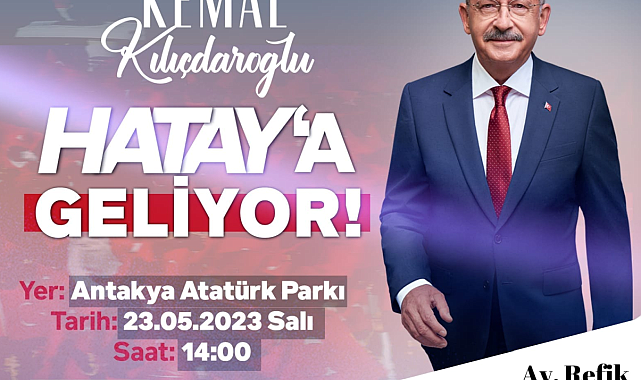 Samandağ Belediye Başkanı Refik Eryılmaz, vatandaşları, 13. Cumhurbaşkanı Adayı ve CHP Genel Başkanı Kemal Kılıçdaroğlu’nun yarın Hatay’a yapacağı ziyarete davet etti.Millet İttifakı Cumhurbaşkanı Adayı Kemal Kılıçdaroğlu, 23 Mayıs (yarın) saat 14.00’te Antakya Atatürk Parkı'nda Hataylılarla bir araya gelecek. Başkan Eryılmaz, Kılıçdaroğlu’nun ziyaretiyle ilgili Twitter hesabından yaptığı paylaşımda, şunları söyledi:“Genel Başkanımız, 13. Cumhurbaşkanı Adayımız Sayın Kemal Kılıçdaroğlu yarın saat 14.00'te Antakya Atatürk Parkı'nda hemşehrilerimizle bir araya gelecek. Tüm hemşehrilerimizi bekliyoruz.”