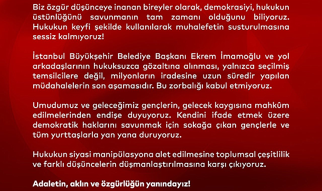 (ANKARA) - Oyuncu, yönetmen, şarkıcı ve edebiyatçıların aralarında bulunduğu 500'den fazla sanatçı, dört gündür gözaltında bulunan İstanbul Büyükşehir Belediye Başkanı Ekrem İmamoğlu'na destek açıklaması yaptı. Açıklamada, "Biz özgür düşünceye inanan bireyler olarak, demokrasiyi, hukukun üstünlüğünü savunmanın tam zamanı olduğunu biliyoruz. Hukukun keyfi şekilde kullanılarak muhalefetin susturulmasına sessiz kalmıyoruz. İstanbul Büyükşehir Belediye Başkanı Ekrem İmamoğlu ve yol arkadaşlarının hukuksuzca gözaltına alınması, yalnızca seçilmiş temsilcilere değil, milyonların iradesine uzun süredir yapılan müdahalelerin son aşamasıdır. Bu zorbalığı kabul etmiyoruz" ifadelerine yer verildi.İstanbul Büyükşehir Belediye Başkanı Ekrem İmamoğlu, yürütülen soruşturmalar kapsamında dört gündür gözaltında. Ahmet Mümtaz Taylan, Ahmet Telli, Ahmet Ümit, Ataol Behramoğlu, Berna Laçin, Birsen Tezer, Bülent Ortaçgil, Cahit Berkay, Ceylan Ertem, Defne Samyeli, DUMAN, Emin Alper, Erdal Güney, Haluk Bilginer, Haydar Ergülen, Hayko Cepkin, İrem Sak, Levent Üzümcü, Mert Fırat, Mor ve Ötesi, Nur Sürer, Rutkay Aziz, Suavi, Sunay Akın, Şükrü Erbaş, Vahide Perçin ve Zülfi Livaneli'nin de aralarında bulunduğu 500'den fazla oyuncu, yönetmen, şarkıcı ve edebiyatçı, İmamoğlu'na destek açıklaması yaptı. Suavi'nin sosyal medya hesabından paylaştığı açıklama şöyle:"Hukuk, adalet ve demokrasi için omuz omuza!Biz özgür düşünceye inanan bireyler olarak, demokrasiyi, hukukun üstünlüğünü savunmanın tam zamanı olduğunu biliyoruz. Hukukun keyfi şekilde kullanılarak muhalefetin susturulmasına sessiz kalmıyoruz!İstanbul Büyükşehir Belediye Başkanı Ekrem İmamoğlu ve yol arkadaşlarının hukuksuzca gözaltına alınması, yalnızca seçilmiş temsilcilere değil, milyonların iradesine uzun süredir yapılan müdahalelerin son aşamasıdır. Bu zorbalığı kabul etmiyoruz.Umudumuz ve geleceğimiz gençlerin, gelecek kaygısına mahkum edilmelerinden endişe duyuyoruz. Kendini ifade etmek üzere demokratik haklarını savunmak için sokağa çıkan gençlerle ve tüm yurttaşlarla yan yana duruyoruz.Hukukun siyasi manipülasyona alet edilmesine toplumsal çeşitlilik ve farklı düşüncelerin düşmanlaştırılmasına karşı çıkıyoruz.Adaletin, aklın ve özgürlüğün yanındayız!"