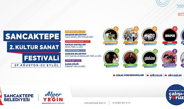 (İSTANBUL)- Sancaktepe Belediyesi tarafından düzenlenen Kültür Sanat Festivali, 29 Ağustos-2 Eylül günleri arasında sanatseverlerle buluşuyor. Festival kapsamında Türkiye’nin önde gelen sanatçılarının sahne alacağı konserlerin yanı sıra çeşitli kültürel etkinlikler de gerçekleştirilecek.Sancaktepe Belediyesi Kültür Sanat Festivali, 29 Ağustos-2 Eylül günleri arasında, ülkenin önde gelen sanatçılarının konserlerine ve renkli etkinliklere ev sahipliği yapacak.Sanata olan ilgiyi artırmak ve halkı bir araya getirmek amacıyla düzenlenecek festivalde çocuklara ve kadınlara özel çeşitli etkinlikler ve kadın-çocuk atölyeleri de yer alacak.Ayazma Yaşam Vadisi, Sancaktepe Meydan Park ve Sarıgazi Festival alanında gerçekleşecek festivalin etkinlik takvimi şöyle:-29 Ağustos Cuma: Ayazma Yaşam Vadisi19:30 Kasım Taşdoğan Konseri20:00: Ataşehir Belediyesi Halk Dansları Topluluğu20:30 İmera Konseri22:00 Kardeş Türküler-30 Ağustos Cuma: Meydan Park20:00: Kafkas Kartalları Dans Topluluğu21:00: Gripin Konseri-31 Ağustos Pazar: Meydan Park 20:00: Çankaya Belediyesi Haytur Halk Dansları Topluluğu21:00: Haluk Levent Konseri-1 Eylül Pazartesi: Sarıgazi Festival Alanı20:00: Metin&Kemal Kahraman Konseri21:00: Revşan Konseri22:00: Pinhani Konseri-2 Eylül Salı: Sarıgazi Festival Alanı20:30: Türküler Sevdamız Konseri22:00: Ceylan Ertem Konseri