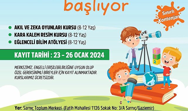 Gaziemir Belediyesi’nin Sarnıç Toplum Merkezi’nde 8-12 yaş aralığındaki çocuklar için düzenlediği akıl ve zeka oyunları, karakalem resim kursu ve eğlenceli bilim atölyesinin kayıtları, 26 Ocak Cuma gününe kadar devam edecek.
