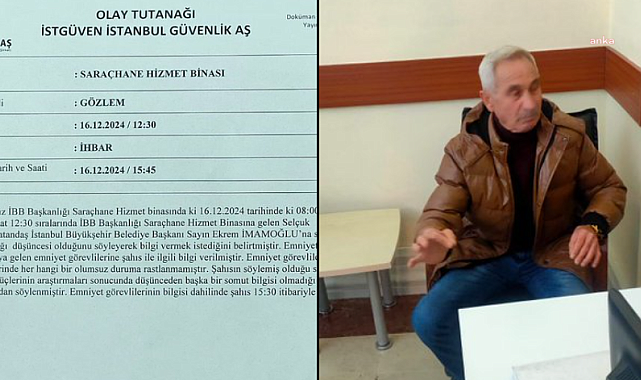 (İSTANBUL) - CHP Genel Başkanı Özgür Özel'e saldıran Selçuk Tengioğlu'nun İBB'ye gelerek "Ekrem İmamoğlu'na suikast yapılacak" dediği ana ilişkin görüntüler ve ihbar tutanağı ortaya çıktı. Tutanakta, "Binaya gelen emniyet görevlilerine şahıs ile ilgili bilgi verilmiştir. Emniyet görevlilerince şahsın yapılan GBT kontrollerinde her hangi bir olumsuzluğa rastlanmamıştır." ifadeleri yer alıyor.CHP Lideri Özel'e saldıran Selçuk Tengioğlu'nun 16 Aralık 2024 tarihinde İBB'nin başkanlık binasının bulunduğu Saraçhane'ye giderek "Ekrem İmamoğlu'na suikast yapılacak" dediği ana ait görüntüler ve İSTGÜVEN İstanbul Güvenlik AŞ'ye yaptığı ihbar tutanağı ortaya çıktı.Tutanakta şu ifadeler yer alıyor:"Görev yaptığımız İBB Başkanlığı Saraçhane Hizmet binasında ki 16.12.2024 tarihinde ki 08.00/17.00 nöbetimiz esnasında saat 12.30 sıralarında İBB Başkanlığı Saraçhane Hizmet Binasına gelen Selçuk Tengioğlu isimli vatandaş İstanbul Büyükşehir Belediye Başkanı Sayın Ekrem İmamoğlu'na suikast girişiminde bulunacağı düşüncesi olduğunu söyleyerek bilgi vermek istediğini belirtmiştir.Emniyet güçlerine haber verilmiştir. Binaya gelen emniyet görevlilerine şahıs ile ilgili bilgi verilmiştir. Emniyet görevlilerince şahsın yapılan GBT kontrollerinde her hangi bir olumsuzluğa rastlanmamıştır. Şahsın söylemiş olduğu suikast bilgisinin de emniyet güçlerinin araştırmaları sonucunda düşünceden başka bir somut bilgisi olmadığı bilgisi emniyet güçleri tarafından söylenmiştir. Emniyet görevlileri bilgi dahilinde şahıs 15:30 itibariyle bölgeden ayrılmıştır."