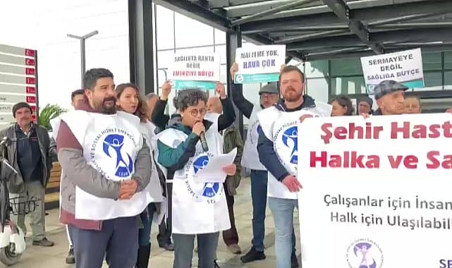 Kamu Emekçileri Sendikaları Konfederasyonu’na (KESK) bağlı Sağlık Emekçileri Sendikası (SES) İzmir şubeleri, Bayraklı Şehir Hastanesi’nde yaşanan sorunlarla ilgili hastane önünde basın açıklaması yaptı. “Şehir Hastanesi sermayaye rant, halka ve sağlık emekçilerine çile! Çalışanlar için insanca bir çalışma ortamı ve yaşanabilir ücret; halk için ulaşılabilir, nitelikli, ücretsiz sağlık hizmeti istiyoruz!” pankartı açan sağlık emekçileri, “Rant için değil, halk için sağlık hizmeti”, “Şehir Hastanesi değil, şehir efsanesi”, “Usülsüz görevlendirilmeler durdurulsun”,” Malzeme yok, hasta çok” dövizlerini taşıdı.