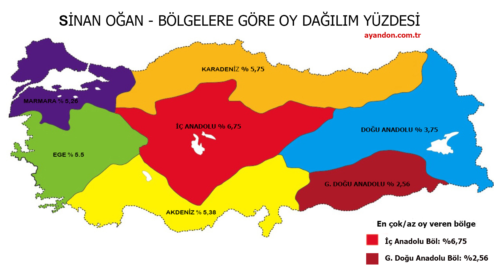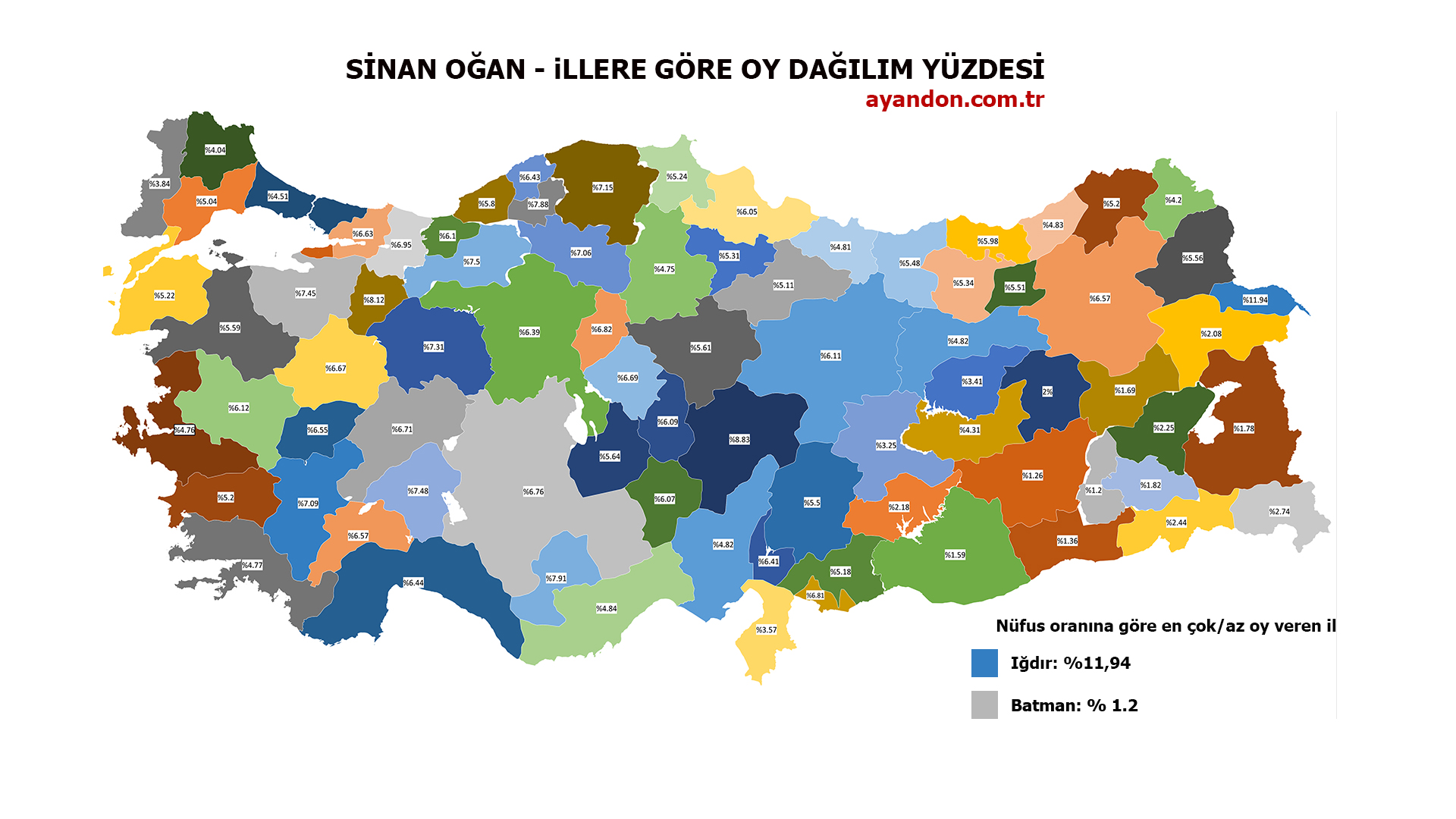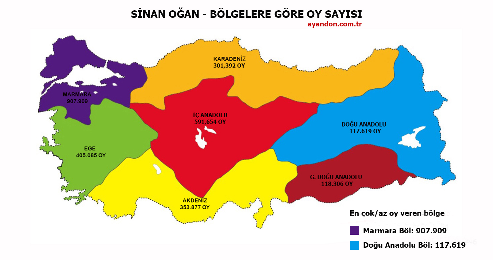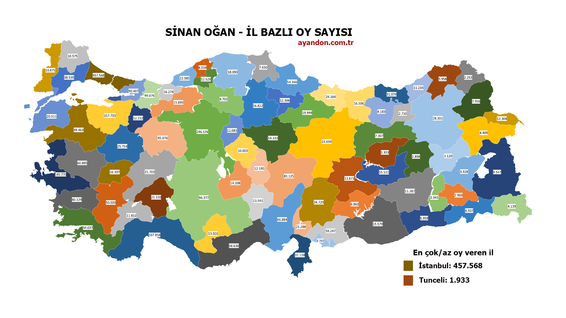 14 Mayıs seçimlerinden sonra Türkiye'nin en çok konuşulan ismi Sinan Oğan'ın Türkiye genelindeki dengeli oy dağılımı her kesimden oy aldığını gözler önüne serdi.Sinan Oğan en çok oyu 457.468 oyla İstanbul'dan alırken, nüfus bazında en büyük oyu memleketi Iğdır'dan %11,94 oranıyla aldı. Oğan en az oyu ise 1,933 oyla Tunceli'den alırken, nufus bazında en az oyu % 1.2 oy oranıyla Batman'dan aldı.Sinan Oğan bölge bazında en çok oyu 907.909 oyla Marmara Bölgesinden alırken, nüfus bazında en çok oyu %6,75 oranıyla İç Anadolu Bölgesinden aldı. Oğan en az oyu 117,619 oyla Doğu Anadolu Bölgesinden alırken, nüfus bazında en az oyu %2,56 oy oranıyla Güney Doğu Anadolu Bölgesinden aldı.