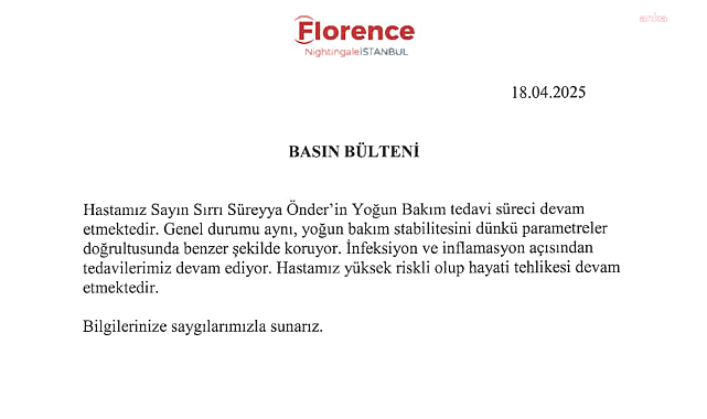 (ANKARA) - Florence Nightingale İstanbul Hastanesi'nin TBMM Başkanvekili ve DEM Parti İmralı Heyeti üyesi Sırrı Süreyya Önder'in yoğun bakım tedavi sürecinin devam ettiğini belirttiği açıklamasında, "Genel durumu aynı, yoğun bakım stabilitesini dünkü parametreler doğrultusunda benzer şekilde koruyor. Hastamız yüksek riskli olup hayati tehlikesi devam etmektedir" denildi.Kalpten çıkan ana damarında meydana gelen yırtılma nedeniyle İstanbul'da 12 saat süren ameliyatın ardından DEM Partili TBMM Başkanvekili Sırrı Süreyya Önder'in güncel sağlık durumuna ilişkin Florence Nightingale İstanbul Hastanesi, açıklama yaptı. Açıklamada, şunlar kaydedildi:"Hastamız Sayın Sırrı Süreyya Önder'in Yoğun Bakım tedavi süreci devam etmektedir. Genel durumu aynı, yoğun bakım stabilitesini dünkü parametreler doğrultusunda benzer şekilde koruyor. İnfeksiyon ve inflamasyon açisindan tedavilerimiz devam ediyor. Hastamız yüksek riskli olup hayati tehlikesi devam etmektedir."