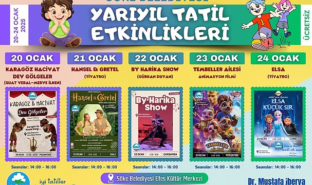 (AYDIN)- Söke Belediyesi, çocuklara yarıyıl tatilinde keyifli anlar yaşatacak bir etkinlik takvimi hazırladı. Etkinlikler, 20-24 Ocak 2025 tarihleri arasında Söke Belediyesi Efes Kültür Merkezi’nde gerçekleşecek.Söke Belediyesi, yarı yıl tatilinde öğrencilerin vakitlerini eğlenceli ve verimli geçirmesi için bir dizi etkinlik düzenleyecek. Ücretsiz yapılacak etkinlikler, her gün saat 14.00 ve 16.00’da çocuklarla buluşacak. 20 Ocak pazartesi Hacivat Karagöz Dev Gölgeler Gölge Oyunu, 21 Ocak Sslı Hansel ve Gretel Tiyatro Gösterisi, 22 Ocak çarşamba By Harika Show, 23 Ocak perşembe Tembeller Ailesi Animasyon Filmi, 24 Ocak cuma Elsa Tiyatro Gösterisi çocuklara unutulmaz saatler yaşatacak.Belediye Başkanı Mustafa İberya Arıkan, etkinliklerin çocuklar için eğlenceli bir deneyim olmasını dilediklerini belirtti.