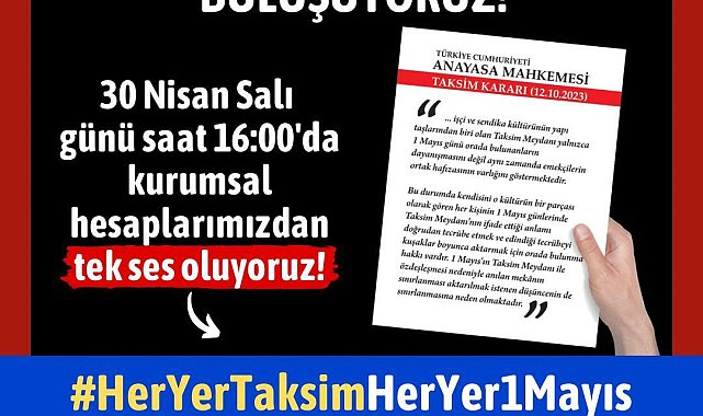 (İSTANBUL)- Sendikalar ve meslek örgütleri, Anayasa Mahkemesi’nin “hak ihlali” kararına karşın Taksim Meydanı’nda 1 Mayıs İşçi Bayramı kutlamalarının yasaklanmasına karşı sosyal medya platformu X’te “Her yer Taksim her yer 1 Mayıs” etiketiyle kampanya başlattı.Devrimci İşçi Sendikaları Konfederasyonu (DİSK), Kamu Emekçileri Sendikaları Konfederasyonu (KESK), Türk Mühendis ve Mimar Odaları Birliği (TMMOB), Türk Tabipleri Birliği (TTB) ve Türk Dişhekimleri Birliği (TDB) öncülüğünde bu yılki 1 Mayıs İşçi Bayramı’nın Taksim Meydanı’nda kutlanması için çağrı yapılmıştı. İstanbul Valiliği ise Anayasa Mahkemesi’nin verdiği “hak ihlali” kararına karşın meydanın kutlamalara kapalı olduğunu açıklamıştı.Konfederasyonlar ve meslek örgütleri, sosyal medya platformu X’te etiket kampanyası başlattı. Çok sayıda kullanıcı, “Her yer Taksim her yer 1 Mayıs” paylaşımları yapmaya başladı. Etiket, kısa sürede Türkiye gündemine girdi.