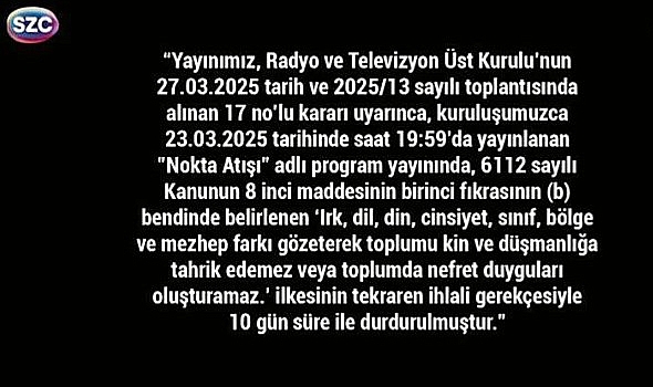 (İSTANBUL) - Sözcü TV, RTÜK'ün uyguladığı 10 günlük yayın durdurma cezasının ardından saat 00.00 itibariyle karartıldı.Radyo ve Televizyon Üst Kurulu (RTÜK) tarafından 10 gün yayın durdurma cezası verilen Sözcü TV'nin ekranı karartıldı. Kanalın ekranında şu ifadeler yer alıyor:"Yayınımız, Radyo ve Televizyon Üst Kurulu'nun 27.03.2025 tarih ve 2025/13 sayılı toplantısında alınan 17 no'lu kararı uyarınca, kuruluşumuzca 23.03.2025 tarihinde saat 19:59'da yayınlanan "Nokta Atışı" adlı program yayınında, 6112 sayılı Kanunun 8 inci maddesinin birinci fıkrasının (b) bendinde belirlenen 'Irk, dil, din, cinsiyet, sınıf, bölge ve mezhep farkı gözeterek toplumu kin ve düşmanlığa tahrik edemez veya toplumda nefret duyguları oluşturamaz.' ilkesinin tekraren ihlali gerekçesiyle 10 gün süre ile durdurulmuştur."