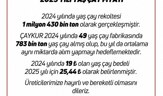 (ANKARA)- Tarım ve Orman Bakanlığı, 2024 yılında 19 lira olan yaş çay bedelini, 2025 yılı için kilogram başına 25,44 lira olarak belirledi.Tarım ve Orman Bakanlığı'nın sosyal medya hesabından yapılan açıklamada, şunları kaydedildi:''2024 yılında yaş çay rekoltesi 1 milyon 430 bin ton olarak gerçekleşmiştir. ÇAYKUR 2024 yılında 49 yaş çay fabrikasında 783 bin ton yaş çay almış olup, bu yılda ortalama aynı miktarda alım yapmayı hedeflemektedir. 2024 yılında kilogramı 19 lira olan yaş çay bedeli 2025 yılı için kilogramı 25,44 lira olarak belirlenmiştir. Üreticilerimize hayırlı ve bereketli olmasını dileriz."