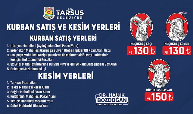 Yaklaşan Kurban Bayramı dolayısıyla Tarsus’ta kurbanlık fiyatları ile satış ve kesim yerleri belirlendi. Bu yıl 28 Haziran 2023 Çarşamba günü başlayacak 1 Temmuz 2023 Cumartesi günü sona erecek Kurban Bayramı öncesinde, Tarsus Kasaplar Odası Kurbanlık Fiyat Belirleme Komisyon kararına göre; küçükbaş keçi kilogram fiyatı 130 TL, küçükbaş koyun kilogram fiyatı 130 TL, büyükbaş kurbanlık kilogram fiyatı 150 TL olarak belirlenirken, Tarsus Belediyesi tarafından da kurbanlık satış yerleri ve kurban kesim yerleri duyuruldu. Tarsus'taki kurbanlık satış yerleri; Hürriyet Mahallesi (Aydoğanlar Shell Petrol Yanı) Ergenekon Mahallesi Gazipaşa Bulvarı otoban ışıklar off road alanı üstü, Gazipaşa Mahallesi Gazipaşa Bulvarı ile Mehmet Akif Ersoy Caddesi’nin kesişim noktasındaki boş alan, 82 Evler Mahallesi İbni Sina Bulvarı Kuvayi Milliye Parkı arkasındaki boş alan ve Belediye Mezbahanesi içi olarak açıklandı. Kurban kesim yerleri ise Turkuaz Pazar Alanı, Tekke Mahallesi Pazar Alanı, Bağlar Mahallesi Pazar Alanı, Kırklarsırtı Mahallesi Pazar Alanı, Yenice Mahallesi Mezarlık Yolu, Gülek Muhtarlık Binası Yanı olarak belirlendi.
