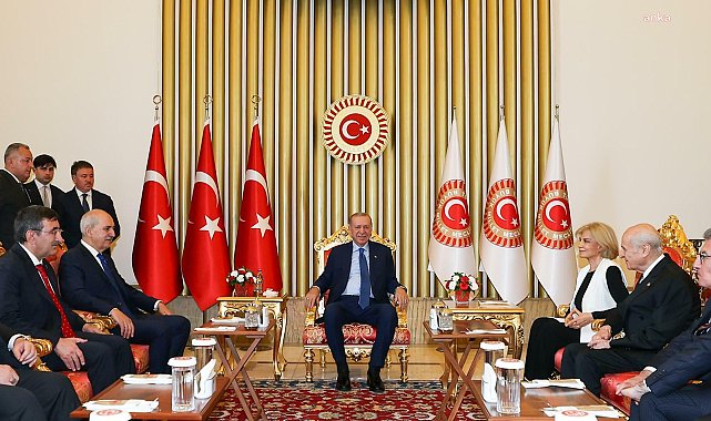 (TBMM) - TBMM'de düzenlenen 15 Temmuz Demokrasi ve Milli Birlik Günü Anma Töreni'ne katılan Cumhurbaşkanı Recep Tayyip Erdoğan, törenin ardından tören salonunun bitişiğindeki Mermerli Salon'da MHP Genel Başkanı Devlet Bahçeli, eski Başbakan Tansu Çiller, BBP Genel Başkanı Mustafa Destici ve törene katılan diğer siyasilerle bir araya gelerek çay içti.TBMM Tören Salonu'nda "Zaferin Adı Türkiye" temasıyla 15 Temmuz Demokrasi ve Milli Birlik Günü Anma Programı düzenlendi. Törene, Cumhurbaşkanı Erdoğan ve TBMM Başkanı Numan Kurtulmuş'un yanı sıra MHP Genel Başkanı Devlet Bahçeli, Cumhurbaşkanı Yardımcısı Cevdet Yılmaz, TBMM Başkanvekilleri, partilerin grup başkanvekilleri, eski TBMM Başkanları, eski başbakanlar, siyasi partilerin liderleri ve temsilcileri, gaziler, şehit ve gazi yakınları katıldı. Törenin ardından, Cumhurbaşkanı Erdoğan, törene katılan Devlet Bahçeli, eski Başbakan Tansu Çiller, BBP Genel Başkanı Mustafa Destici'nin de bulunduğu siyasilerle bir araya gelerek çay içti ve sohbet etti.Görüşmede Numan Kurtulmuş, Cumhurbaşkanı Yardımcısı Cevdet Yılmaz, eski TBMM Başkanı Mustafa Şentop, AK Parti Grup Başkanı Abdullah Güler, Aile ve Sosyal Hizmetler Bakanı Mahinur Özdemir Göktaş, TBMM Başkanvekili Celal Adan da yer aldı. Görüşmeye ilişkin paylaşılan fotoğrafta, Tansu Çiller'in Erdoğan'ın hemen sağında Devlet Bahçeli'nin yanında oturması dikkati çekti.