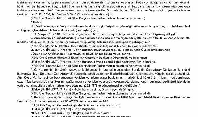 (ANKARA) - CHP Grup Başkanvekili Murat Emir, TBMM Genel Kurulu'nda Can Atalay ile ilgili hak ihlali kararının okunduğu bölüm tutanaktan çıkarılmasına, "İlgili bürokratlar Meclis Başkanvekilinin yaptığı bir işlemi içtüzüğe aykırı olarak niteleyemez. Böyle bir haddi ve hakkı olamaz. İçtüzük bir kez daha siyasi talimatla çiğnenmiştir." diyerek tepki gösterdi.Emir, sosyal medya hesabından yaptığı açıklamada, "Bugünkü TBMM Genel Kurul tutanakları tam olarak yayınlanmaya başlandı ama içtüzüğe aykırı bir biçimde '(*) Bu bölümde, Türkiye Büyük Millet Meclisi gündeminde yer almayan bir okuma işlemi TBMM İçtüzüğü’ne aykırı olarak yapılmıştır.' İbaresi eklenerek… İlgili bürokratlar Meclis Başkanvekilinin yaptığı bir işlemi içtüzüğe aykırı olarak niteleyemez. Böyle bir haddi ve hakkı olamaz. İçtüzük bir kez daha siyasi talimatla çiğnenmiştir." dedi.