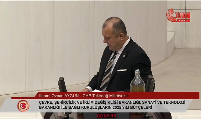 Genel Kurul'da konuşma yapan CHP Tekirdağ Milletvekili İlhami Özcan Aygün, yanında Cengiz Holding'in maden ocağı nedeniyle ağaç kesmesini protesto etmek için getirdiği çam kozalağı, Ergene Nehri'nden getirdiğini söylediği kirli su dolu şişe ve Marmara Denizi'nden getirdiğini söylediği müsilaj dolu şişeyle kürsüye çıktı.