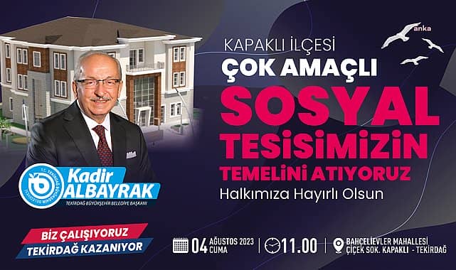 Tekirdağ Büyükşehir Belediyesi, Kapaklı’da önemli bir eksikliği giderecek olan Kapaklı Çok Amaçlı Sosyal Tesis için ilk adımı atıyor. Kapaklı Çok Amaçlı Sosyal Tesis'in temeli, 4 Ağustos 2023 Cuma günü düzenlenen törenle atılacak.Tekirdağ Büyükşehir Belediyesi Kapaklı Çok Amaçlı Sosyal Tesis’in temeli, 4 Ağustos Cuma günü saat 11.00’de Bahçelievler Mahallesi’nde yapılacak törenle atılacak. Bodrum, zemin artı 2 normal kattan oluşacak Kapaklı Çok Amaçlı Salon projesinde mescitler, idari ofis, arşiv, teknik hacimler, depo, çok amaçlı salon, atölyeler, derslikler, bilgisayar odası, kafeterya ve muhtarlık birimi yer alıyor.Çok Amaçlı Sosyal Tesisin Kapaklı’nın kentin sosyal hayatına renk katacağını belirten Tekirdağ Büyükşehir Belediye Başkanı Kadir Albayrak, şunları söyledi:“Tekirdağ Büyükşehir Belediyesi olarak il genelinde proje ve yatırımlarımıza devam ediyoruz. Bu kapsamda, Kapaklı ilçemizde önemli bir açığı kapatacak ve vatandaşlarımızın sosyal hayatına canlılık getirecek olan Çok Amaçlı Salon’un temelini atıyor olmanın mutluluğunu yaşıyoruz. Kapaklı Çok Amaçlı Salonu’muzun temeli, 4 Ağustos 2023 Cuma günü saat 11.00’de Bahçelievler Mahallesi’nde gerçekleştirilecek törenle atılacak. Tüm halkımızı temel atma törenimize bekliyoruz. Yaklaşık 20 milyon TL yatırım maliyetine sahip tesisimiz şimdiden Kapaklı’mıza hayırlı olsun” dedi.