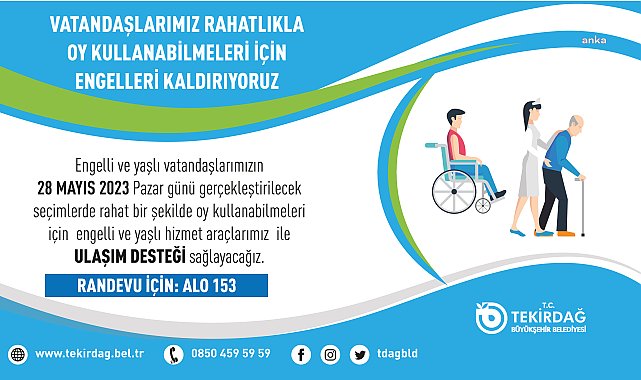 Tekirdağ Büyükşehir Belediyesi, 28 Mayıs 2023 Pazar günü engelli ve yaşlı vatandaşların rahat bir şekilde oy kullanabilmeleri için ulaşım desteği sağlayacak. Vatandaşlar, ALO 153 numaralı çağrı merkezini arayıp randevu alarak ulaşım desteğinden faydalanabilecek.Tekirdağ Büyükşehir Belediyesi 28 Mayıs 2023 Pazar günü gerçekleştirilecek olan Cumhurbaşkanlığı 2. tur seçimlerinde engelli ve yaşlı vatandaşların rahat bir şekilde sandık başına gidebilmeleri için ulaşım desteği sağlayacak. Hizmetten faydalanmak isteyen engelli ve yaşlı vatandaşlar, ALO 153 numaralı çağrı merkezini arayarak randevu alabilecek.