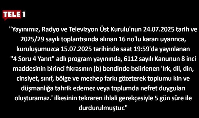 (İSTANBUL) - Radyo Televizyon Üst Kurulu'nun (RTÜK), "yayınlarda toplumun kin ve düşmanlığa tahrik edilemeyeceğine" ilişkin fıkrayı ihlal ettiği iddiasıyla TELE1’e verdiği 5 günlük yayın durdurma cezası uygulamaya kondu. Yayın durdurma kararı kapsamında, TELE1 ekranı bu geceden itibaren 5 gün karartıldı.TELE1 Televizyonu ekranları, 00.00 itibarıyla 5 günlük yayın durdurma cezası kapsamında karardı.RTÜK, Radyo ve Televizyonların Kuruluş ve Yayın Hizmetleri Hakkında Kanun'un 8. maddesindeki, "yayınlarda toplumun kin ve düşmanlığa tahrik edilemeyeceğine" ilişkin fıkrayı ihlal ettiği iddiasıyla TELE1'e 5 günlük yayın durdurma cezası ile brüt ticari iletişim gelirinin yüzde 5'i oranında idari para cezası vermişti.TELE1'in bu kararının iptali ve yürütmesinin durdurulması istemiyle açtığı davada, Ankara 23. İdare Mahkemesi, söz konusu RTÜK kararının yürütmesinin durdurulması istemini reddetmişti.Yapılan itirazlardan sonuç alınamaması üzerine, TELE1 ekranı, bu geceden itibaren 5 gün karartıldı. Yayın durdurma kararı kapsamında TELE1 televizyon yayını, 5 gün boyunca kesintiye uğrayacak.TELE1'e destek vermek için kanala gelen basın meslek örgütü temsilcileri, RTÜK'ün, muhalif yayınlara halkın erişim hakkını engellediğini, haber alma hakkını ihlal ettiğini belirterek, karara tepki gösterdi.