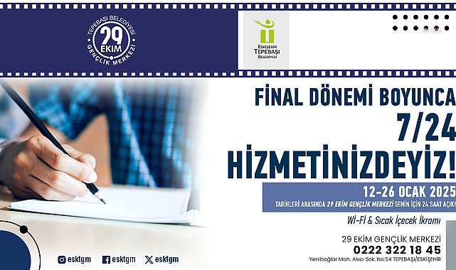 (ESKİŞEHİR)- Tepebaşı Belediyesi 29 Ekim Gençlik Merkezi, 12-26 ocak günlerinde arasında final sınavları dolayısıyla üniversite öğrencilerine 24 saat hizmet verecek.Tepebaşı Belediyesi 29 Ekim Gençlik Merkezi, üniversite öğrencileri için 24 saat hizmet verecek. Merkezde final sınavları dönemiyle birlikte uygulamaya koyulan 7/24 açık kütüphane hizmeti kapsamında öğrencilere ücretsiz çay ve su, sınırsız internet hizmeti, sesli ve sessiz salonlarda ders çalışma ortamı sunulacak.24 saat açık olacak merkezde sunulacak hizmetleri çok faydalı bulduğunu kaydeden üniversite öğrencileri de memnuniyetini belirterek, Tepebaşı Belediye Başkanı Ahmet Ataç’a teşekkürler etti.