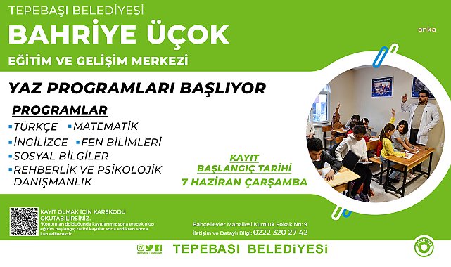 Tepebaşı Belediyesi Bahriye Üçok Eğitim ve Gelişim Merkezi’ndeki yaz programları için kayıtlar başladı. Merkezde, öğrencilerin akademik ve sosyal gelişimini destekleyen programlar yer alıyor.Tepebaşı Belediyesi tarafından düzenlenen eğitim ve etkinlikler ile çocukların gelişimine önemli katkılar sunacak Bahriye Üçok Eğitim ve Gelişim Merkezi için kayıtlar başladı. Bahçelievler Mahallesi'nde hizmet veren Bahriye Üçok Eğitim ve Gelişim Merkezi’nde uzman eğitmenler tarafından 4,5,6,7 ve 8. sınıf öğrencilerine yönelik akademik ve sosyal gelişimi destekleyici programlar düzenleniyor. Bu kapsamda merkezde, yaz programları Matematik, Fen Bilimleri, İngilizce, Türkçe, Sosyal Bilgiler ve Rehberlik gibi alanlarda öğrencilere eğitim desteği verilecek. Ücretsiz olarak düzenlenecek programlara kayıt olmak isteyenler kayıt formuna, duyuru görselinde yer alan QR kod ile ulaşabilecek. Yetkililer tarafından yapılan açıklamada, “Kontenjanların dolmasının ardından kayıtlar sona erecektir. Eğitim başlangıç tarihi kayıtlar sona erdikten sonra ilan edilecektir” denildi. Öte yandan programlar hakkında detaylı bilgi almak isteyen vatandaşlar, 0 (222) 320 27 42 numaralı telefondan yetkililere ulaşabilecek.