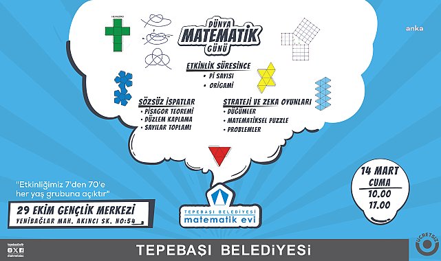 (ESKİŞEHİR)- Tepebaşı Belediyesi tarafından hizmete sunulan ve her yaştan insana farklı metotlar ile matematiği sevdirmeyi hedefleyen Matematik Evi, Dünya Matematik Günü dolayısıyla farklı etkinlikler gerçekleştirecek.Tepebaşı Belediyesi Matematik Evi, Dünya Matematik Günü dolayısıyla düzenleyeceği etkinlikler ile 7’den 70’e herkesin, matematiğin eğlenceli yönünü keşfetmesini sağlayacak.UNESCO tarafından Dünya Matematik Günü olarak ilan edilen gün kapsamında 14 Mart gününde, Matematik Evi tarafından matematiğin alışılmamış yönleri keşfedilecek. Öğrencilerin yanı sıra matematiğe ilgi ve merak duyan tüm vatandaşların davet edildiği Dünya Matematik Günü etkinlikleri kapsamında Pi sayısı, origami, Pisagor teoremi sayılar toplamı, düğümler, matematiksel puzzle ve problemler etkinlikleri katılımcılar ile buluşacak. Katılımın ücretsiz olacağı etkinlikler 14 Mart Cuma günü 10.00-17.00 saatleri arasında Yenibağlar Mahallesi 29 Ekim Gençlik Merkezi’nde düzenlenecek.Tepebaşı Belediyesi yetkilileri, matematik bilgi seviyesi gözetmeksizin her vatandaşın etkinliğe katılabileceğini belirterek, tüm kent sakinlerini programa davet etti.