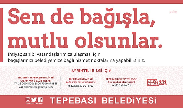 Tepebaşı Belediyesi, bu Kurban Bayramı’nda da bağış yapmak isteyen yardımsever vatandaşlar ile ihtiyaç sahipleri arasında köprü olacak.Tepebaşı Belediyesi her yıl olduğu gibi bu Kurban Bayramı’nda da duyarlı vatandaşların bağışlarını, ihtiyaç sahiplerine ulaştıracak.Yardımlarını ihtiyaç sahiplerine ulaştırmak isteyen Eskişehirliler, Tepebaşı Belediyesi Nihal-İsmail Akçura Aşevi’ne kurban bağışında bulunabilecek. Öte yandan, Tepebaşı Belediyesi Melih Savaş Yaşam Köyü’ne nakdi bağış yapmak isteyen vatandaşlar, Vakıfbank Eskişehir Şubesi Sağlık İşleri Müdürlüğü Alzheimer Merkezi'nin TR28 0001 5001 5800 7300 8781 65 IBAN numaralı hesabına bağışta bulunabilecek.Tepebaşı Belediyesi Nihal-İsmail Akçura Aşevi’ne kurban bağışı hakkında bilgi almak isteyen vatandaşlar, 0 (222) 340 04 02 numaralı telefondan yetkililere ulaşabilecek.