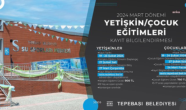 Tepebaşı Belediyesi Mustafa Kemal Atatürk Spor Tesisleri Su Sporları Merkezi’nin 2024 Mart ayı çocuk ve yetişkin kayıt talepleri alınmaya başladı.Tepebaşı Belediyesi’nin uluslararası Leeds sertifikalı çevreci binası Mustafa Kemal Atatürk Spor Tesisleri Su Sporları Merkezi, kent halkını yüzme sporu ile buluşturmayı sürdürüyor. Merkezde, 2024 Mart ayı yetişkin ve çocuk eğitimleri için ön kayıtlar başladı. Kayıt talepleri https://tesis.tepebasi.bel.tr üzerinden alınıyor. Kayıt bırakma tarihi ise 19 Şubat ile 25 Şubat tarihlerinde gerçekleşecek. Ön kayıtların alınmasının ardından kesin kayıt yaptıranlar eğitime 27 Şubat’ta başlayacak.Konu hakkında detaylı bilgi almak isteyen vatandaşlar, 0 (222) 310 39 45 numaralı telefondan yetkililere ulaşabilecek.