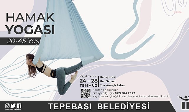 Tepebaşı Belediyesi tarafından düzenlenecek Hamak Yogası için kayıtlar başlıyor.Tepebaşı Belediyesi, her yaştan kent sakini için fayda sağlayacak fiziksel etkinlikler düzenlemeye devam ediyor. Bu kapsamda gerçekleştirilecek Hamak Yogası programı için kayıtlar yarın başlayacak. Kayıtların 28 Temmuz’da sona ereceği Hamak Yogası eğitimleri Behiç Erkin Halı Sahası Çok Amaçlı Salon’da düzenlenecek. Vücut esnekliğini ve dengesini artırmasının yanı sıra sindirim ve lenfatik sistemler ile kan dolaşımının gelişmesine katkıları ile de bilinen hamak yogası eğitimleri, uzman eğitmenler gözetiminde gerçekleştirilecek.Hamak Yogası’na kayıtlar, duyuru görselindeki QR kod üzerinden ulaşılan formun doldurulması ile yapılıyor. Kontenjanların sınırlı olduğu ve 20-45 yaş arası vatandaşların faydalanabileceği Hamak Yogası ücreti ve kayıt hakkında bilgi almak isteyen vatandaşlar, 0 (222) 324 25 22 numaralı telefondan yetkililere ulaşabiliyor.