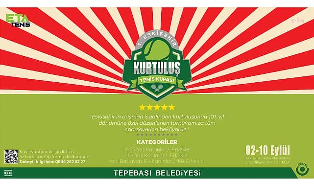 Tepebaşı Belediyesi, Eskişehir’in düşman işgalinden kurtuluşunun 101’inci yıl dönümü dolayısıyla tenis turnuvası düzenleyecek.Tepebaşı Belediyesi ve ETA Tenis iş birliği ile düzenlenecek tenis turnuvası için kayıtlar başladı.Eskişehir’in düşman işgalinden kurtuluşunun 101’inci yılına özel düzenlenen turnuvaya 13-35 yaş, 36 yaş ve üzeri ile yeni başlayan 13 yaş ve üzeri sporseverler başvurabiliyor.02-10 Eylül arasında gerçekleşecek turnuvaya katılmak isteyenler, duyuru görselinde bulunan QR kodu okutarak formu doldurabiliyor. Ayrıca detaylı bilgi almak isteyenler 0 (544) 262 52 27 numaralı telefondan yetkililere ulaşabiliyor.